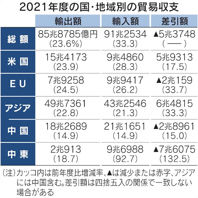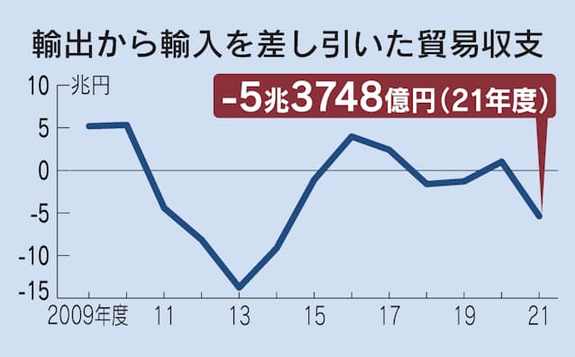 財務省が20日発表した2021年度の貿易統計速報によると、輸出から輸入を差し引いた貿易収支は5兆3748億円の赤字となった。貿易赤字は2年ぶり。赤字幅は過去4番目の水準で、原子力発電所の稼働が落ち込み、火力発電用の燃料の輸入が膨らんだ14年度以来、7年ぶりの大きさとなった。