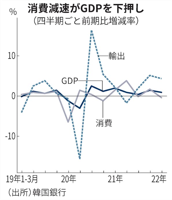 1~3月期の消費は前期比で0.5%減と、前四半期の1.6%増から一転してマイナス成長となった。3月に世界最多の新規感染者数を記録した新型コロナウイルス禍や、ロシアのウクライナ侵攻で加速する物価高などの影響とともに、市場関係者の間で韓国経済の悪材料として指摘されるのが家計負債の増加に伴う金利負担増だ。