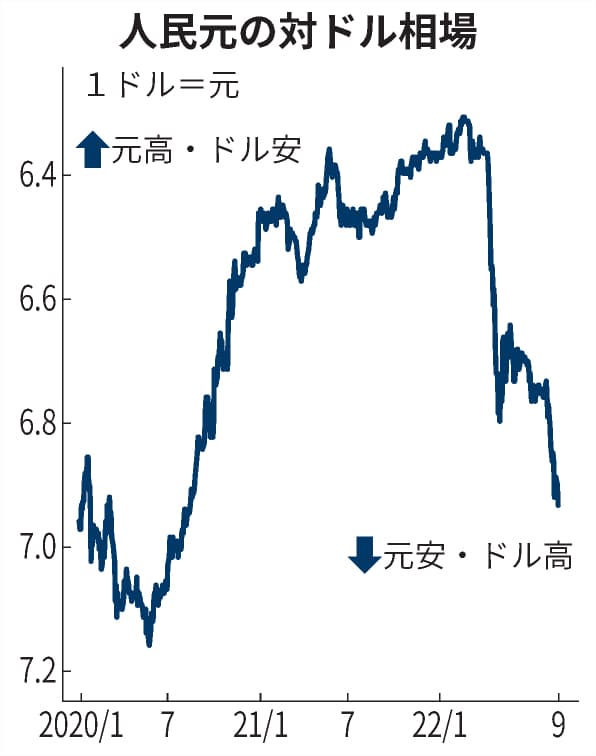 足元で元は下落が続いている。5日の上海外国為替市場で元は1ドル=6.937元で取引を終えた。20年8月17日以来の安い水準だ。