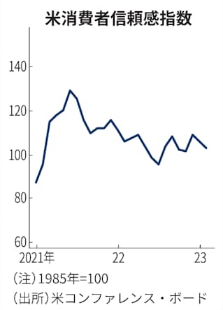 【ニューヨーク=佐藤璃子】米調査会社コンファレンス・ボードが28日発表した2月の米消費者信頼感指数は、前月の改定値から3.1ポイント下落し102.9となった。2カ月連続で低下した。足元の景況感を示す指数は小幅に上昇したものの、短期的な見通しを示す指数は低下した。消費者の米経済に対する先行き懸念が強まっていることを映した。