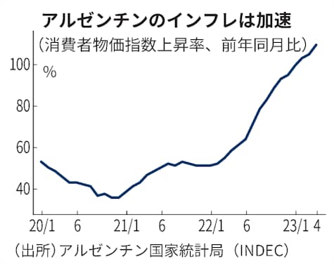 【サンパウロ=宮本英威】アルゼンチン国家統計局(INDEC)が12日発表した2023年4月の消費者物価指数は、前年同月比で108.8%上昇した。上昇率は過去30年で最も大きい。歴史的な干ばつや通貨安を背景に、商品やサービスの価格が軒並み上昇している。