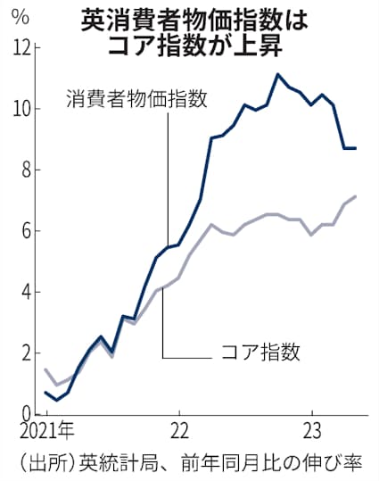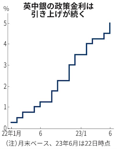 5月の英消費者物価指数は前年同月比8.7%上昇と、市場予想に反して伸び率が鈍化しなかった。エネルギーや食品などを除くコア指数の上昇率は7.1%上昇と1992年3月以来の高水準だった。賃上げを求めてストライキが頻発し、4月の平均賃金の伸び率は6.5%と2カ月連続で上昇した。