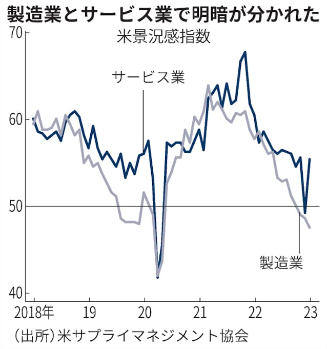 【ニューヨーク=大島有美子】米サプライマネジメント協会(ISM)が3日発表した1月の米非製造業(サービス業)景況感指数は前月2022年12月分から6ポイント高い55.2となった。2カ月ぶりに好不況の節目である50を超えた。企業の活動や新規受注が回復した。低迷が続く製造業とは明暗が分かれた。